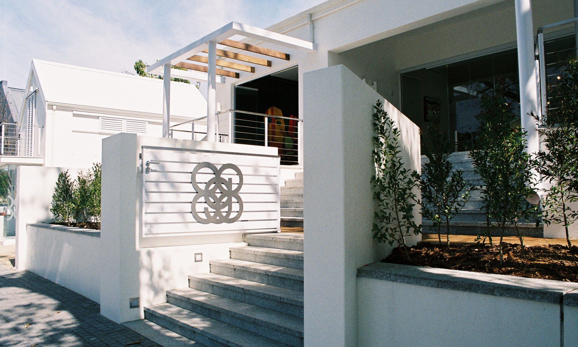 The diagonal is reinforced by the trajectory of two sets of approach steps, leading from the pavement to the front entrance. These broad steps, as they rise, cross a horizontal layering of levels – a planter with a single row of young trees, a linear area for the display of sculpture and finally the terraces along the east elevation of the existing building. The wide terrace which extends to the right of the approach steps is an extension of the existing stoep of the house. Together with terraces along the north and west elevations, it enlarges the footprint of the original building. The progression up the steps heightens the sense of approach. Arrival itself is enhanced by the wide doorway with the butt-aligned frameless glass panels folded back.
