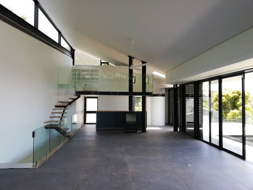 Situated on the slopes of Table Mountain overlooking central Cape Town and Table Bay, this 4-storeyed new house was designed to create a new large level garden-plateau on the sloping site. A street-level basement garage for 4 cars with a new arrival garden-court was cut into the mountain slope, with the entrance hall beyond leading to generous stairs to the upper levels, and a new passenger elevator serving 3 storeys. Tall sliding doors,- all with solar-screening slatted aluminium shutters, overlook the garden to the North and the dramatic views toward the bay, and the Swartland, 50km beyond. The principal living spaces are on the upper levels to capture the views. Here the main living room is a sizeable volume measuring approximately 14m by 7m under a high sloping ceiling that opens toward the magnificent Table Mountain views to the South, and terrace and balcony spaces to the North, all overlooking the manicured, calm, rectangular garden below. In addition to the 5 en-suite bedrooms, there is a self-contained double-storeyed apartment reached from a side garden. An extensive range of sustainable features have been incorporated, including photo-voltaic power, rainwater harvesting, solar and security control to all glazed openings, in-screed piped water heating, and wood-burning fireplaces. The garden view over the city is edged by a 12m swimming pool high above the suburban roadway below.